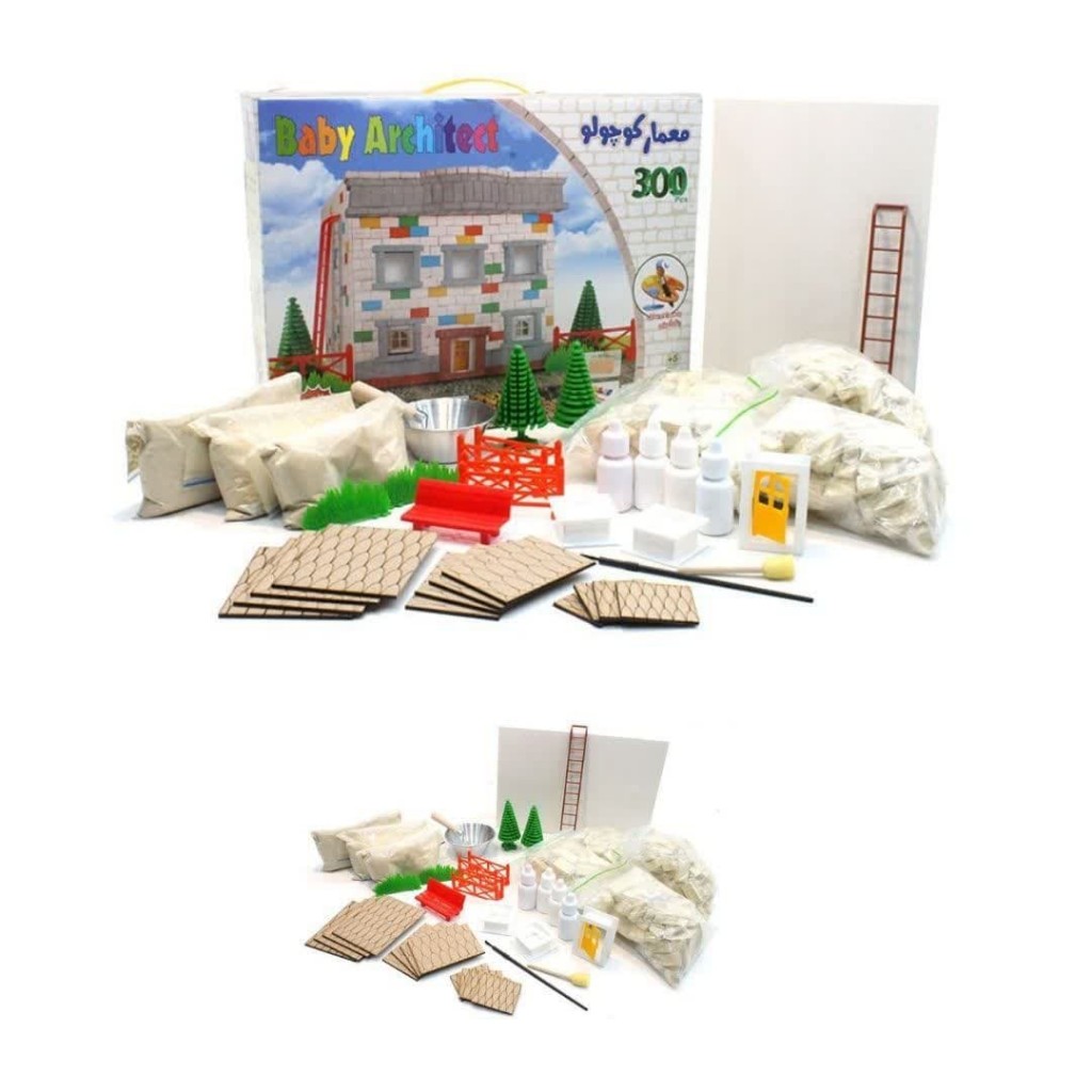 معمار کوچولو پیشرفته حاوی 300 قطعه آجر مستطیلی در ۴ سایز مختلف -12 قطعه آجر مکعبی -4 قطعه آجر مثلثی-2 قطعه آجر بام شیروانی - 1 عدد کمچه__1عدد صفحه زیر کار_2عدد پایه سازه چوبی با ابعاد 10×10 سانتی متر_12عدد تایل سقف در سه سایز مختلف _1عدد درب_2عدد پنجره_2عدد سبزه_4عدد نرده _2عدد درخت _1عدد قلم مو _4عدد رنگ_1عدد ظرف ساخت ملات -3بسته پودر ملات -کمچه و استانبولی و دفترچه راهنما میباشد .